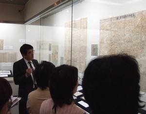 特別講演会「東アジアと世界地図」 雙峰祭2日目。今日は、本企画展の特別講演会「東アジアと世界地図」が開催されました。講師は人文社会科学研究科准教授 大塚秀明先生です。 その後「秋岡コレクション世界古地図集成」のビデオの上映。日本における世界図の系統全般を見ながら、マテオ=リッチ系の世界図、重訂万国全図の世界図としての意義を確認する目的です。 ----------------------------------------------------------------------- [マテオ=リッチ系世界図] 楕円形 漢字の地名 アジアが中心 南極部分にメガラニカという大陸 [蘭学系世界図] 2つの半球図 ヨーロッパの知識が直接伝来 探検結果の反映 「新訂万国全図」(「重訂万国全図」の元)は蘭学系世界図だが、間宮林蔵の北方探検の結果が反映されるなど、日本人自らの知識を盛り込んでいる。 ----------------------------------------------------------------------- ビデオで基礎知識を得た後、大塚先生のお話を聞きます。 1. 西洋世界図の中国化 2. 漢字表記の永続性と広域性:17世紀の世界図 3. 漢字表記の収集整理と定着:19世紀の世界地理書 4. リッチの翻訳の基礎方言について 5. 文化の伝来 ・マテオ=リッチが参考にしたといわれるオルテリウスの世界図と「坤輿万国全図」を比べた時に、同じところ(①楕円形にタテヨコの線②五大洲(六大陸))と、違うところ(①中央の位置②地名・地理学用語の漢字表記)がある ・「坤輿万国全図」やそれに続く「職方外紀」でマテオ=リッチらが使い始めた漢字の地名には、現在も使われているものがある(欧羅巴、亜細亜、意大里亜(イタリアの中国語での表記)、地中海、赤道など)。19世紀に確立されたものもある(諳厄利亜→英吉利など)。 ・”亜細亜”と「アジア」:”細”は「ジ」と読めるか。 ・昨年度の企画展の三大奇書「三国志」「水滸伝」「西遊記」の伝来は、書物のみの伝来で、誤訳などが生まれた。世界図の伝来には、地図の伝来とその解説者(発音者)の存在があった。 など、中国語がご専門の大塚先生ならではの視点でのお話、とても面白かったです。 終了後、いくつか質問も寄せられました。 ・「重訂万国全図」の色刷について --- これについては色刷用の版木は見つかっていません。全面に色がのっているわけではないので、部分的に色をつける手法(ステンシルのような合羽摺、小さな版木を判子のように押す方法)が考えられるが、現在のところはっきりしたことはわかっていません。 ・国土地理院の常設展示に「重訂万国全図」に似た地図があるが、同じものか? --- 未確認です。何かわかりましたら、お知らせします。 ・版木の来歴について --- 頒暦所(幕府天文方、箱書きにあり)→大学南校(東大の前身)まではわかるが、その後の来歴は記録がありません。古くから学内に伝えられていたもので、今春附属図書館の所蔵となりました。 その後、場所を移して、展示室でのギャラリートークへと続きました。 たくさんの方のご参加、ありがとうございました。さて、明日は学園祭最終日。版木の特別公開も明日までです。どうぞお見逃しなく! | |