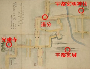 ------------------------------------------------------------------ 当日は曇り。日焼けの心配がなかったのは良いのですが、青空に杉並木!みたいな写真が撮れず残念でした。 「日光御参詣宇都宮御目見・御供開場所絵図」(180度回転) ※地図で 宇都宮を表示 こうやって並べてみると、同じ道が残っています地名も、「材木町」「伝馬町」「江野町」「池上町」など絵図の中にある当時の地名が残ってます。 では、出発です! ■宇都宮城【6:32出発】 最初はやはり宿城宇都宮城からです。とはいっても、当時のお城は残っていません。向かったのは、宇都宮城址公園。本丸跡です。H19.3に櫓、お堀、土塁など一部が復元されたそうです。写真は清明台。櫓(やぐら)です。 ■光琳寺【6:50通過】 ちょっと寄り道です。隣の建物がぎりぎりまで迫ってきていますが、木々が茂っている感じは、当時の雰囲気をしのばせる? ■宇都宮明神社 現在は「二荒山(ふたあらやま)神社」。(ここは道から外れているので歩き始める前に寄っておきました) 御由緒を見ると、非常に起源の古い神社なのですね。朝から御祈祷の人々が訪れていて活気があります。 場所も、パルコのはす向かいで、市街地ど真ん中です。 ■日光街道と奥州街道の追分【7:01通過】 いよいよここから北へ向かって歩いていきます。宇都宮を訪れるのはほとんど初めてだというのに、ギョウザも食べてないのに、と後ろ髪をひかれつつ宇都宮市街地を後にします。本当にこの道?という感じのフツーの道です。歩道もありません。しかし、右側の倉のような黒い建物、由緒正しい雰囲気を醸し出しています。絵図の道の両側に並ぶ宿のうちの一つでしょうか。このあたりは、ゆったり余裕で余計な写真などとりつつぶらぶら歩いていたのですが、このツケがあとでまわってくるのでした・・・。 |