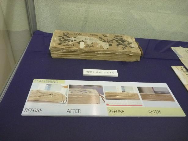 ミニ展示 筑波大学附属図書館研究開発室の「附属図書館における貴重資料の保存と公開」プロジェクトは「保存」と「公開」の2つのサブプロジェクトから構成されています。 今回展示されています資料は、東日本大震災のときに津波により被災した岩手県山田町の資料約300点の一部です。資料の状態調査と保存修復処置(フラットニングおよび補修処理)、および燻蒸処理を行いました。 昨年の11月7日にフラットニングの次のステップの補修処理をしているところを見学させていただきました。補修処理をしていたみなさんは、芸術系の松井敏也先生と紙本修復家の坂本雅美さんのご指導のもと、和紙とメチルセルローズを用いて慎重に修復を行っていました。 |