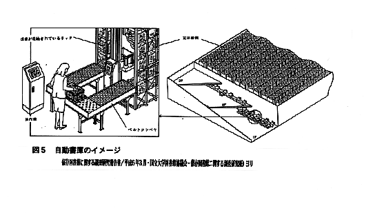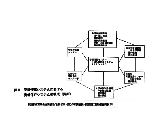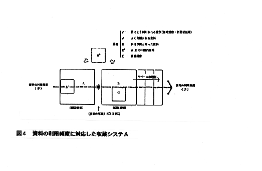 3.資料保存のための手順 (1) すべての資料を保存することはできない → 保存すべき資料についてのポリシーの明確化 / 資料保存のためのプログラム文書の作成 / 「保存 」→「保護 」→「修復 」 (2) 資料を傷めない方策を講じる / 予防的手段 (3) 一時的な保存資料の判定 ・文献年齢 / 利用の実績 / 焼畑方式 (4) 保存・廃棄の基準の確立と移管の手続 / 保存すべき資料・廃棄すべき資料の具体的基準、 有効利用のための移管の手続き ・基準設定の困難さ / 合意の得にくさ(利用に対する確率的な予想の問題)・規定類の 未整備・手続きの煩雑さ・人手不足・他機関に保存されている保障の確認の困難さ etc (5) 保存の仕方の判定/内容の保存か、現物の保存か ・資料・情報の内容の価値 ← 利用頻度、引用頻度 ・現物としての資料価値 歴史的価値(写本、初版本、1850年以前の本 etc) 現物としての価値(美術的・工芸的価値、希本・珍本) 著者の献辞・欄外書き込みなどの価値 ・優先順位(内容の価値、現物としての価値、劣化の状態、他機関での所蔵状況、 適切な保存方法の可能性 etc) (6) 保存のための保護処理の判定 ・ ・利用の状況+資料の価値+破損の状況(劣化の診断)+ 修復の費用+各館の事情 (7) 原型保存か代替保存か ← コストの見積/費用対効果 ・原型保存/製本、修理・修復 ・置き換え・媒体変換/買い替え、複写・複製、マイクロ化、ニューメディア転換 (8) 保存のための配置 ・個々の図書館のニーズ / 大学全体の利用と保存のシステム/地域的・全国的な共同資 料保存プログラムとの関係 ・廃棄、再配置(保存部門への移転等) (9) 利用のための措置 / 目録・レコードの再編成、資料・情報の流通システムの整備 (10) 保存環境の整備と維持 ・保存施設の環境整備 ・保存容器等の使用(中性紙の保存箱、カバー etc) 4.メディアの多様化と電子メディア情報の保存 (1) メディアの多様化と保存 ・電子メディア情報の保存 ・電子メディア機器の更新・変化への対応と保存 (2) 電子図書館化と資料の保存と利用 5.保存資料の利用のシステム (1) オンラインネットワークの進展と資料・情報の利用と保存 (2) 学術情報システムと一次資料の保存 (3) 分担収集・分担保存・相互貸借(ILL)と保存資料 (4) 保存資料の情報検索・遡及入力 (5) 資料・情報の流通 / 物流と電送のシステム 図3 学術情報システムにおける資料保存システムの構成(提案) 保存図書館に関する調査研究報告書/平成6年3月・国立大学図書館協議会・保存図書館に関する調査研究班)より 6.大学における図書館システムと保存システム (1) 総合/研究/学習/保存の各図書館機能の明確化 (2) 保存図書館機能の配置 (3) 学内の資料・情報の流通、学内LANの整備とデリバリーサービス 7.保存システムとスペース・環境の計画 (1) 保存スペースの考え方 ・保存と利用の考え方 ・保存スペースの成長への対応 ・保存スペース/保存書架・保存書庫・保存図書館・共同保存図書館 ・保存スペースの確保と開架書架スペースの適正規模の維持 図4 資料の利用頻度に対応した収蔵システム (2) 収蔵スペースの確保と資料の保全 ・資料の量の合理的抑制(廃棄、交換・寄託)、資料サイズの縮小(マイクロ化、電子メ ディア化)による保存スペースの確保 ・保存スペースの高密度化 ・現物の保存・保護のための環境 ・資料の保存とコスト (3) 書架のタイプと収蔵効率 ・一般書架/積層書庫/集密書架 ・ 自動化(立体自動書庫)の導入 図5 自動書庫のイメージ 保存図書館に関する調査研究報告書/平成6年3月・国立大学図書館協議会・保存図書館に関する調査研究班)より (4) 保存書庫の安全性 ・防火/防水/地震(倒壊・落下)/遮光/防虫/防塵/忘失 ・法規的な問題(建築基準法・消防法 etc、人の安全性/資料の保護) (5) 保存書庫の環境 ・書庫内資料の利用方法と環境(本のための環境・人のための環境) ・温・湿度条件等 8.共同保存図書館の可能性 (1) 劣化対策の共同化 / 劣化対策の技術開発・集中処理・電子媒体化 (2) 保存スペースの共有化 / 保存資料の集中収集と良好な環境での保存 (3) 利用のための共同化と有効利用 / 資料情報の書誌情報・所在情報の作成・提供、保存資 料の検索・参考業務、資料情報の提供、資料の交換・移管および仲介 (4) 運用・業務の効率化 (5) 共同保存図書館の設置 / 地域別・館種別・資料種類別・分類別 (6) 共同保存の段階 / 分担収集・保存 → 共同保存図書館